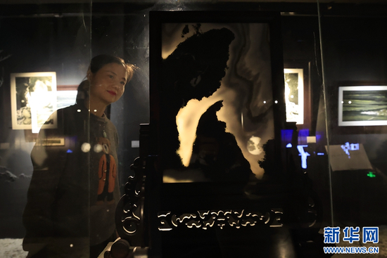 大理石方志馆里,一名游客正在观赏大理石画(摄于4月3日)。(新华网 赵普凡 摄)