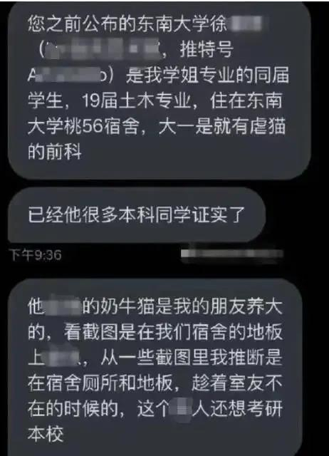 在此之前,有多名网友在网络平台发帖反映,该考生就是前段时间闹得沸沸扬扬的“东南大学虐猫事件”的当事人徐某祥,自称“血肉艺术家Kiri”,曾在学校宿舍虐杀猫,还录制视频上传到网络。