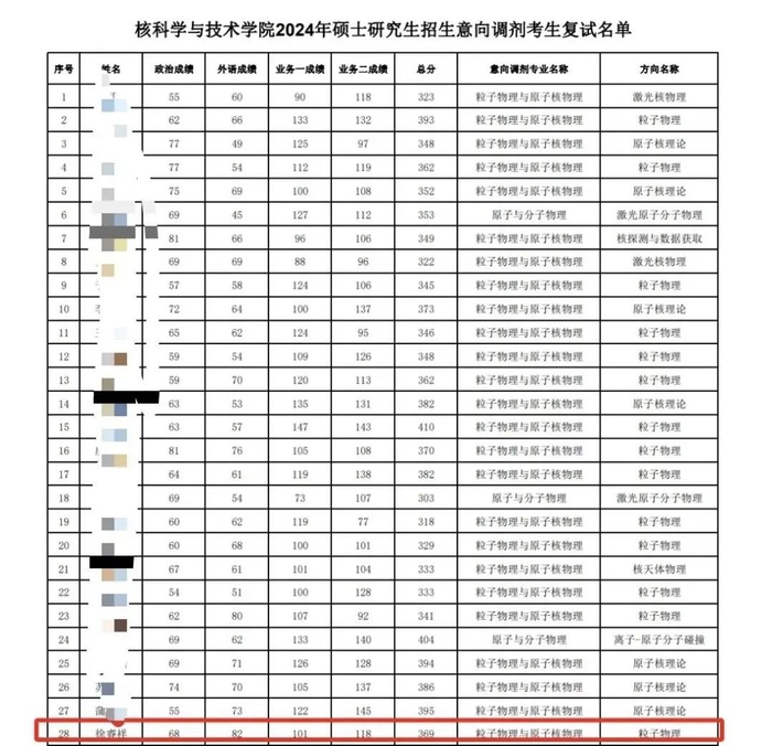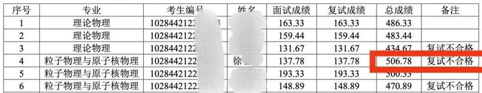 记者了解到,4月2日,南京大学物理学院在其官网公布了2024年硕士研究生招生考试复试成绩及总成绩,这份49人的名单中,有3名考生备注“复试不合格”,粒子物理与原子核物理专业考生徐某祥是其中之一,其面试成绩137.78、复试成绩137.78、总成绩506.78。