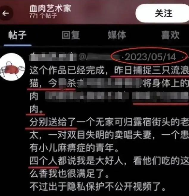 还有网友爆料称,2023年7月,“血肉艺术家”账号在海外社交软件除了发布大量血腥暴力虐杀动物的图文视频外,还有教唆他人自杀的内容,其中一篇为引导他们自杀的方法,之后有人跟帖回应“要去试试”,考虑到事件的严重性,网友随即报警。经警方调查,确定了“血肉艺术家”账号就是徐某祥,并对其进行批评教育。