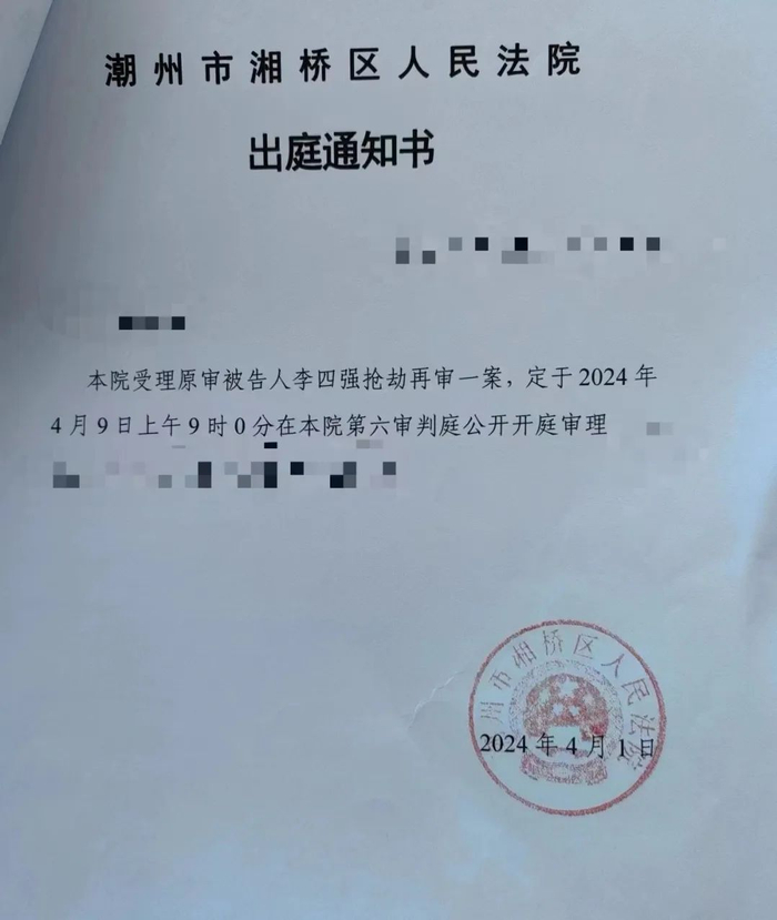 4月9日,“李四强抢劫案”在广东省潮州市湘桥区法院开庭再审。