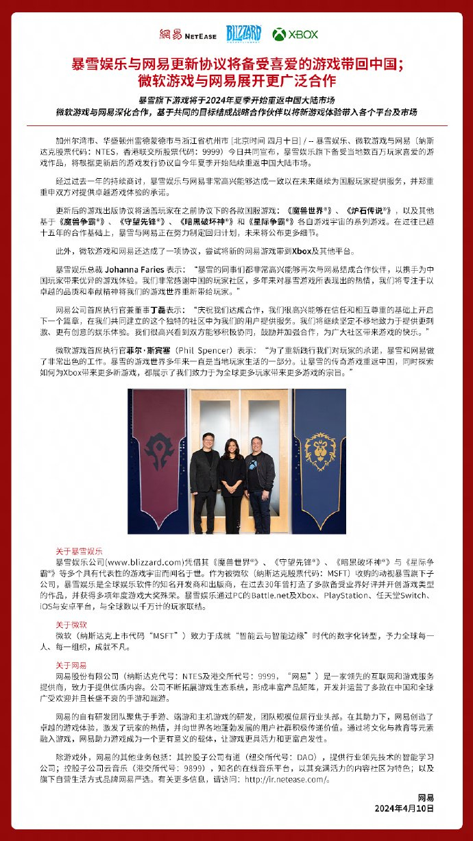 新京报讯 4月10日,网易游戏发文称“我们很荣幸能与暴雪娱乐再次携手,将暴雪游戏重新带回国服。玩家们,久等了! ”
