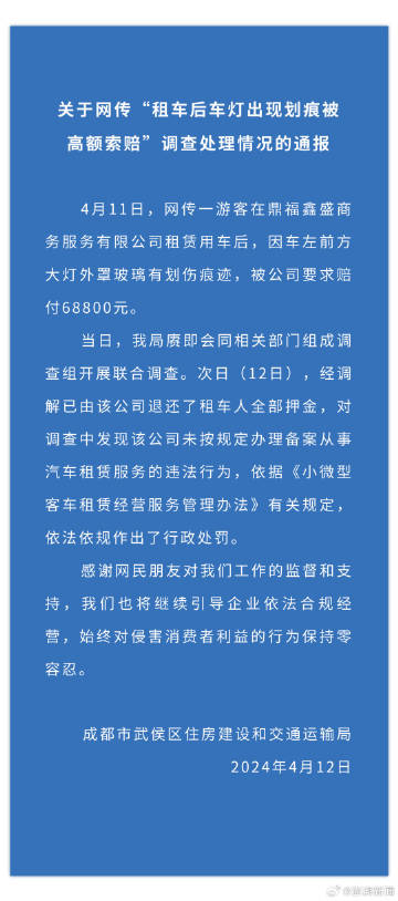 官方通报租车现划痕被索赔6.8万