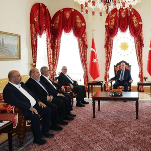 4月20日,土耳其总统埃尔多安(中)在伊斯坦布尔会见来访的巴勒斯坦伊斯兰抵抗运动(哈马斯)政治局领导人伊斯梅尔·哈尼亚(左四)。图/视觉中国