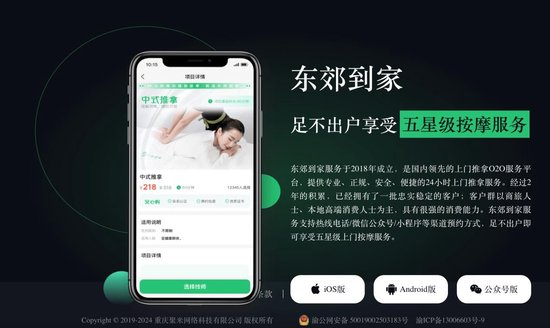 据了解,东郊到家是重庆聚米网络科技公司旗下的上门推拿O2O服务平台,2018年成立,提供24小时上门推拿服务。2019年至今,东郊到家平台用户由不足10万人,增长到超700万人;四年时间完成从1到22个城市,28个运营中心服务网络布局,全国近20000名认证技师。据投融资平台“鲸准”App显示,东郊到家目前估值为35亿元。