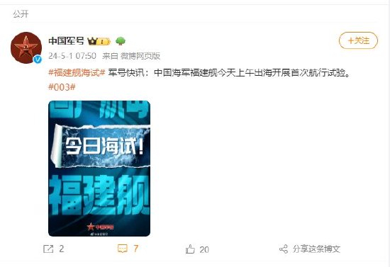 军号快讯:中国海军福建舰今天上午出海开展首次航行试验。
