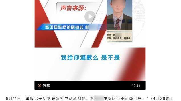 5月13日,蓝桥镇政府一名工作人员向新京报记者表示,目前已经关注到网上的信息,有关部门已经对此开展调查,“彭副镇长早上开会的时候还在,现在在配合调查。”