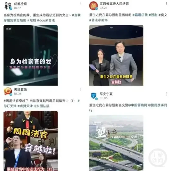 早在今年3月,就有不少蓝V账号开始进入反霸总短剧赛道。江西萍乡市安源区人民法院推出《霸总的100种刑法人生》;江西省高级人民法院发布《重生之我在霸总短剧里当特助》,湖南交警的《重生之我在爽文短剧里当交警》已经拍到第五集;成都检察携手金牛区检察,创作《身为检察官的我重生成为霸总短剧的女主》;天津津南消防拍摄《重生之霸总短剧里的生命通道》;平安宁夏发布《重生之我在霸总短剧当交警》和《重生之我在霸总短剧当民警》……