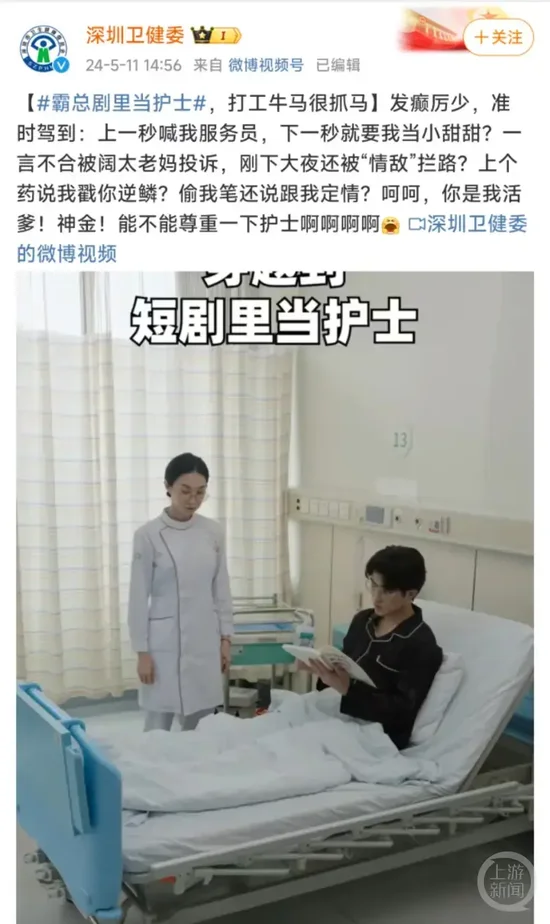 上游新闻记者注意到,深圳市卫健委4月21日发布首个反霸总短剧后,直到5月11日才发布了第二个反霸总短剧《霸总剧里当怨种护士》,两部4分钟的短片,制作周期超过20天。