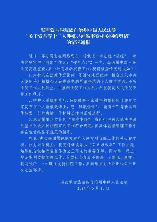海西蒙古族藏族自治州中级人民法院“关于索某等十二人涉嫌寻衅滋事案相关网络舆情”的情况通报