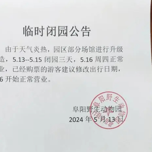 5月13日,阜阳野生动物园发布一则临时闭园公告称,由于天气炎热,园区部分场馆进行升级改造,5月13日-5月15日闭园三天,5.16周四正常营业。
