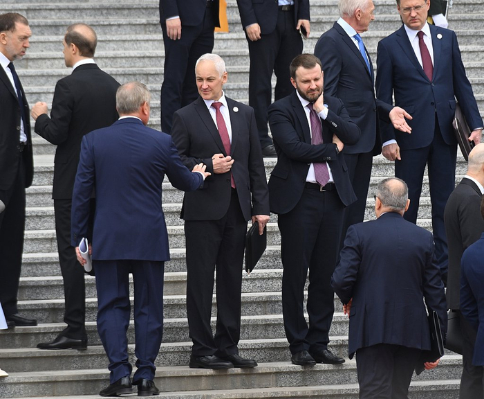 2024年5月16日,北京,俄罗斯总统普京对中国进行工作访问。俄罗斯国防部长安德烈·别洛乌索夫(中,左)和俄罗斯总统助理马克西姆·奥列什金(中,右)在天安门广场人民大会堂举行的俄罗斯总统正式欢迎仪式上。视觉中国 图