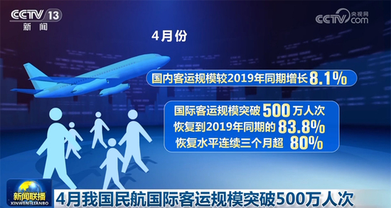 记者从中国民航局获悉,4月份,民航共完成旅客运输量5595万人次,同比增长10.6%。其中,国内客运规模较2019年同期增长8.1%;国际客运规模突破500万人次,恢复到2019年同期的83.8%,恢复水平连续三个月超80%。