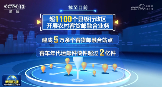 今年以来,我国各地整合农村客运、货运物流、邮政快递资源优势,建设“一点多能”的农村客货邮融合发展站点。截至目前,超1100个县级行政区开展农村客货邮融合业务,建成5万余个客货邮融合站点,客车年代运邮件快件超过2亿件。