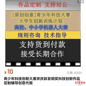 红星新闻记者调查发现,尽管此事尚无定论,但网络上早有不少面向中小学生科研代做的商家,宣传称只需要花费800-3000元就可以代替完成作品,购买产品原件和相关研究报告,功能介绍、创意来源一步到位,全程基本不需要孩子本人参与。