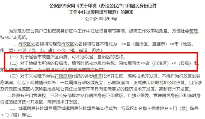 根据公安部《办理公民户口和居民身份证件工作中住址项目填写规范》规定,在公民户口和居民身份证件住址项目中,填写基本格式为:××省(自治区、直辖市)××市(地区、州、盟)××区(县、市、旗)××乡(镇、街道)。对于省会城市或自治区首府,可不冠以省、自治区的名称。