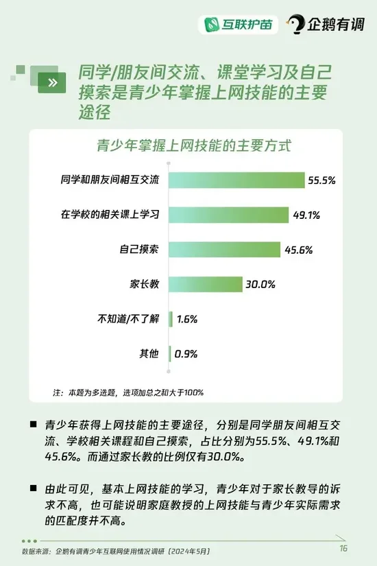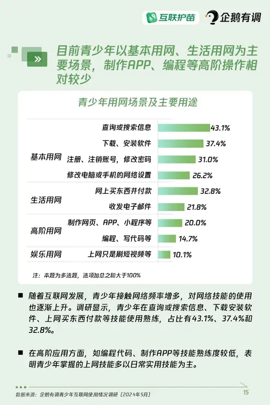 2、青少年网络素养发展现状:半数以上青少年上网技能源自同学和朋友间的交流,且青少年用网场景相对基础,以搜索信息、下载安装软件、网购付款等日常实用类为主。青少年对人工智能的认知度非常高,45.1%使用过人工智能产品。