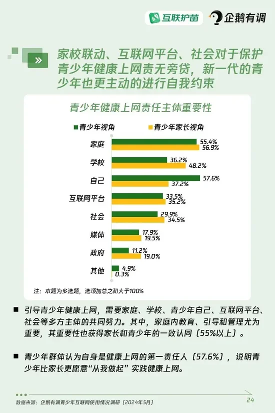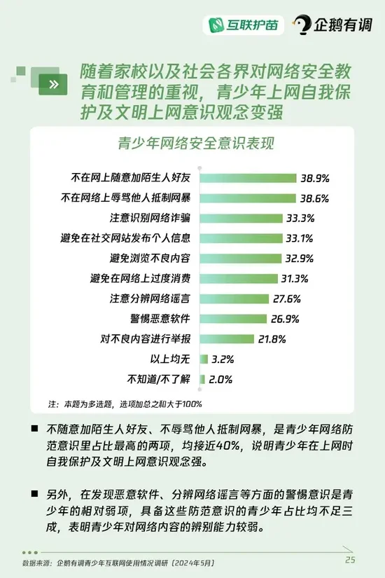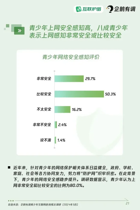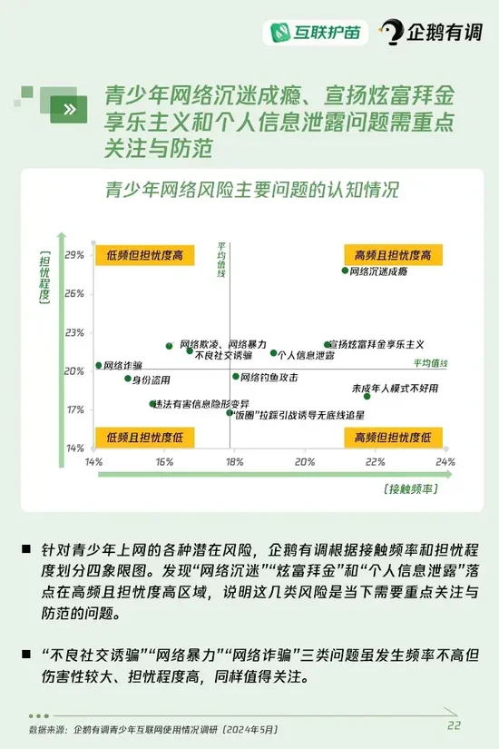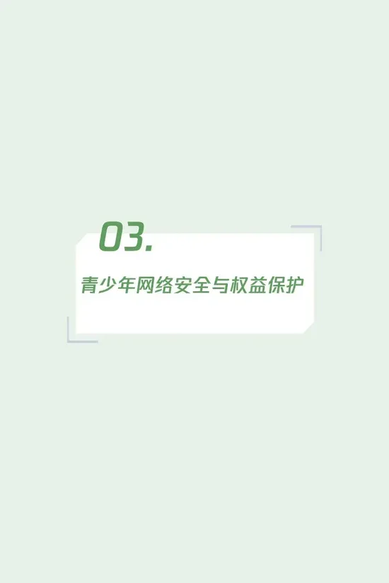 3、青少年网络安全与权益保护:青少年网络安全环境持续改善,80.0%的青少年表示当前上网感知安全,57.6%的青少年认为自己是健康上网的第一责任人。需重点关注与防范网络沉迷成瘾、宣扬炫富拜金享乐主义和个人信息泄露问题。