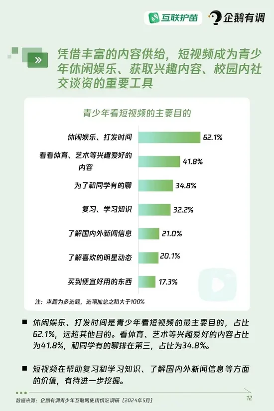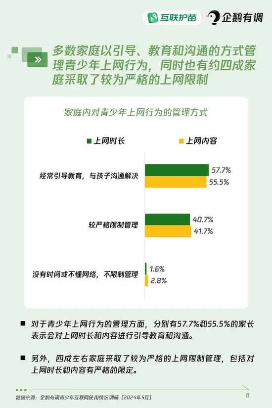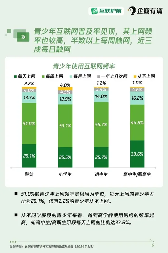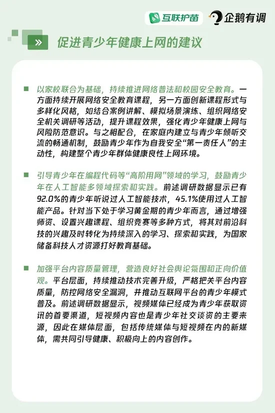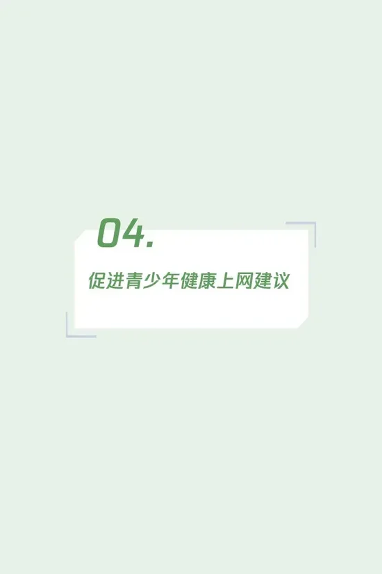 4、促进青少年健康上网的建议:一是家校共育,持续优化校园教育、家庭引导相配合的模式,构建良性上网环境;二是引导青少年尝试高阶用网,鼓励培养青少年在前沿科技领域探索、学习、实践;三是加强内容质量管理,持续推动技术完善升级,推动青少年模式普及。