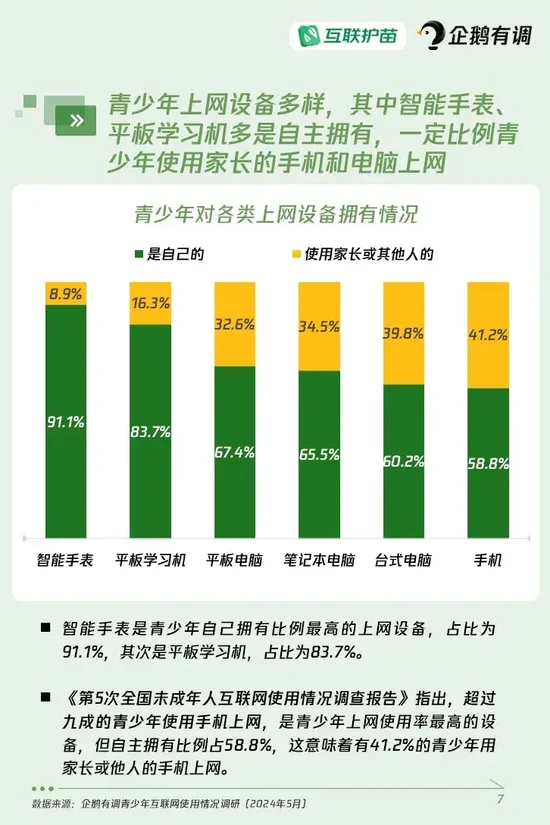1、青少年网络使用基本情况:八成以上青少年每周都会上网,自主拥有的上网设备中以智能手表、平板学习机最为多见,41.2%的青少年用家长或他人的手机上网。青少年上网兼顾学习、娱乐,六成以上家庭认可上网对青少年学习的正向价值。视频类平台超越传统媒体成为青少年获取新闻资讯的主要渠道。