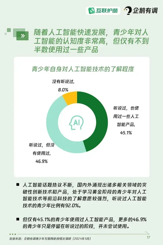 《青少年互联网使用情况调查报告(2024)》重磅发布:超四成青少年使用过AI产品