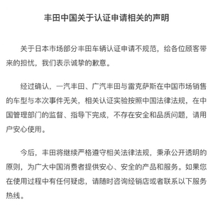 丰田中国:一汽丰田、广汽丰田与雷克萨斯在中国市场销售的车型与认证违规事件无关