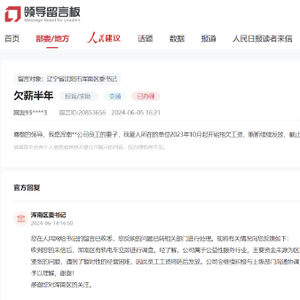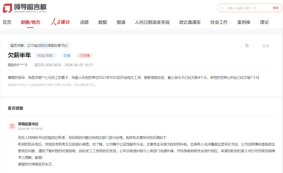6月5日,有网民在人民网“领导留言板”向沈阳市浑南区委书记求助称,其爱人所在的公司“2023年10月起开始拖欠工资,断断续续发放,截止到今天已经欠薪4个月。原有的住房公积金已经欠缴7个月”。