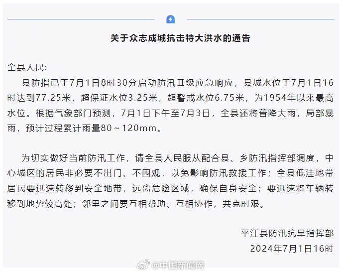 平江县防汛抗旱指挥部7月1日21时25分发布通知,根据当前汛情及气象预测,依据《平江县防汛应急预案》有关规定,县防指决定:自7月1日21时30分起,将全县防汛应急响应提升至Ⅰ级。请各乡镇(街道)、县防指成员单位严格按照防汛Ⅰ级响应的要求,切实履行工作职责,以战时状态投入抗洪抢险,紧急转移危险区群众,做到应转尽转,确保人民群众生命安全。全县所有干部职工全力以赴抢险救灾,做好防汛救灾的各项工作。