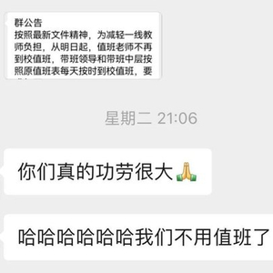 该教师说,从来没想过有一天能不值班,特别开心。入职两年以来,每个假期所有教师都要排班到校值班。“有一次我旅行的票都订好了,才知道那天要值班,又临时取消了。”该教师表示,值班也就是在学校待一天,工作内容包括检查学校的安全情况、接值班电话等。