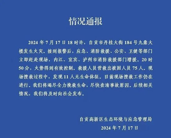 2024年7月17日18时许,自贡市丹桂大街184号九鼎大楼发生火灾。接到报警后,应急、消防救援、公安、卫健等部门立即赶赴现场,内江、宜宾、泸州市消防救援部门增援。20时50分,火势得到有效控制。救援人员营救出被困人员75人。现场搜救过程中,发现11人无生命体征。目前现场搜救工作仍在进行。我们将竭尽全力挽救生命,尽快查清事故原因。后续相关情况,我们将及时向社会发布。