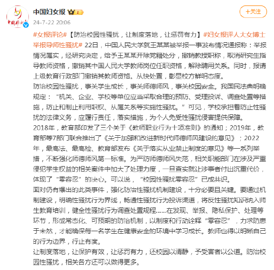 [防治校园性骚扰,让制度落地,让惩罚有力]22日,中国人民大学就王某某被举报一事发布情况通报称:举报情况属实,经研究决定,给予王某某开除党籍处分,撤销教授职称,取消研究生指导教师资格,撤销其中国人民大学教师岗位任职资格,解除聘用关系。同时,报请上级教育行政部门撤销其教师资格。从快处置,彰显校方鲜明态度。