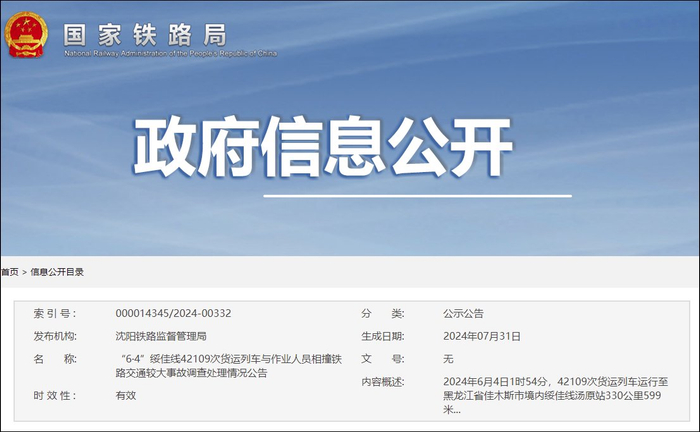 国家铁路局网站7月31日发布“6·4”绥佳线42109次货运列车与作业人员相撞铁路交通较大事故调查处理情况公告。