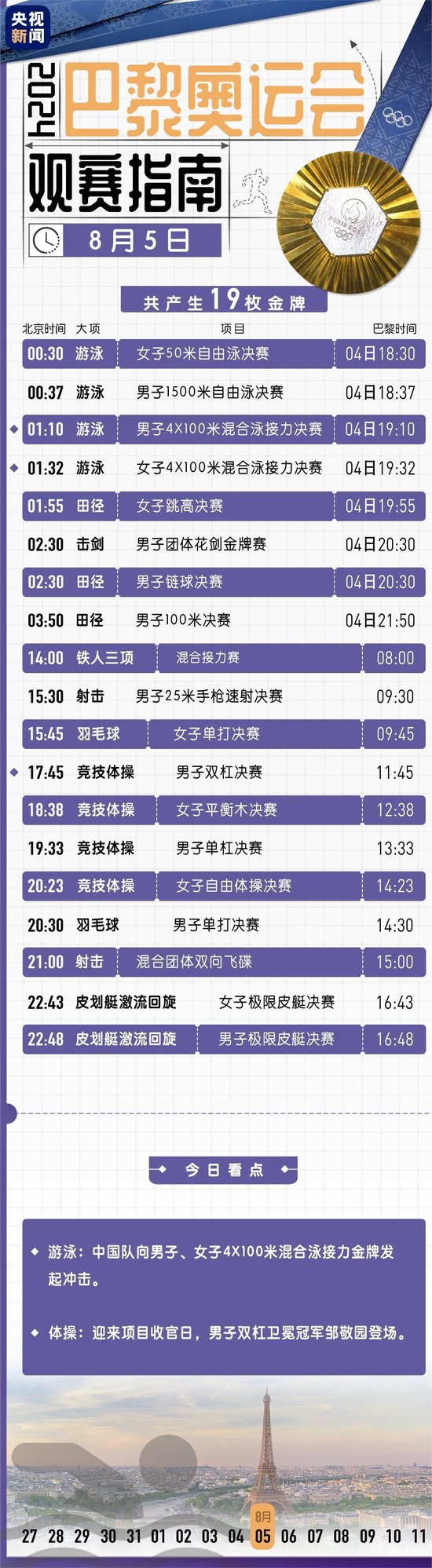 巴黎奥运会第九个比赛日将产生20枚金牌。中国体育代表团将在乒乓球、羽毛球等项目上冲击金牌。