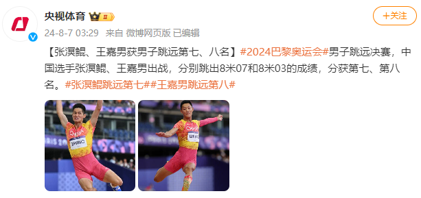 [张溟鲲、王嘉男获男子跳远第七、八名]#2024巴黎奥运会#男子跳远决赛,中国选手张溟鲲、王嘉男出战,分别跳出8米07和8米03的成绩,分获第七、第八名。#张溟鲲跳远第七##王嘉男跳远第八#