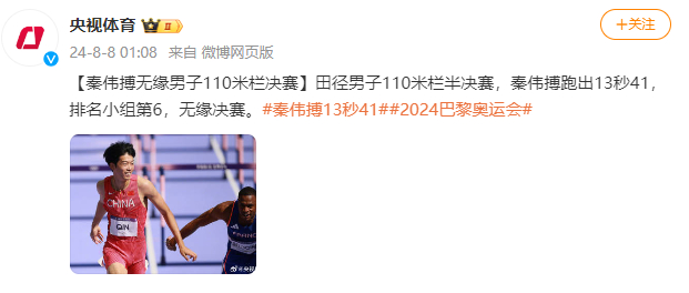 [秦伟搏无缘男子110米栏决赛]田径男子110米栏半决赛,秦伟搏跑出13秒41,排名小组第6,无缘决赛。