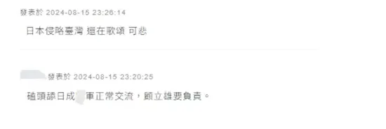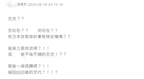 有岛内网友对台防务部门所谓“交流”的说法表示质疑,“交流何在?有日本自卫队的军乐队在场吗?是单方面吧!或是不伦不类的交流!更是一厢情愿吧!是防务部门谁的交代?” 还有人批评称:“日本侵略台湾,还在歌颂,可悲” “磕头舔日成台军正常交流,顾立雄(现任台防务部门负责人)要负责。” “奴民!习惯了” “民进党执政下舔日的台湾” “数典忘祖的东西” “民进党执政一昧地抱美、日大腿,连台军也不断地谄媚、迎合上意。” “又开始‘皇民化’了吗?”