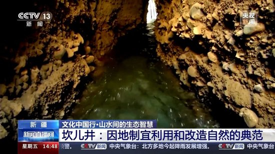 总台央视记者 王晨:在坎儿井的每一条地下暗渠中,清澈的渠水都是自动流淌的,堪称古代的自来水系统。这是因为吐鲁番盆地海拔较低,而盆地北部作为水源地的天山山脉平均海拔在5000米左右,冰川融水进入地下之后顺着北高南低的地势形成自流井,体现出古人因势利导的聪明智慧。