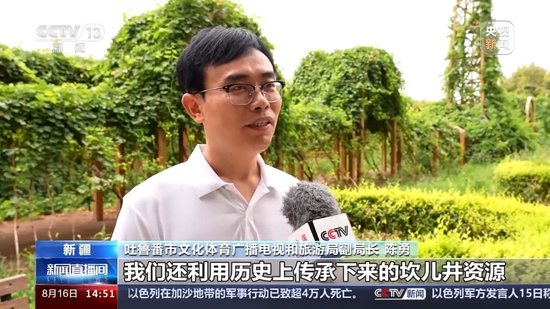 吐鲁番市文化体育广播电视和旅游局副局长 陈勇:除此之外,我们还利用历史上传承下来的坎儿井资源,开设了坎儿井游乐园、民俗园、传承区等特色旅游景区、景点,向国内外游客系统展示了坎儿井的原理结构、开挖技艺、文化内涵以及其中蕴含的生态智慧。凝聚着各族群众智慧的坎儿井,现在已经成为国内外游客到吐鲁番必去的热门“打卡”地。