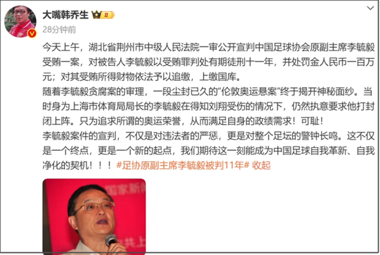 “李毓毅案件的宣判,不仅是对违法者的严惩,更是对整个足坛的警钟长鸣。这不仅是一个终点,更是一个新的起点,我们期待这一刻能成为中国足球自我革新、自我净化的契机!!!”