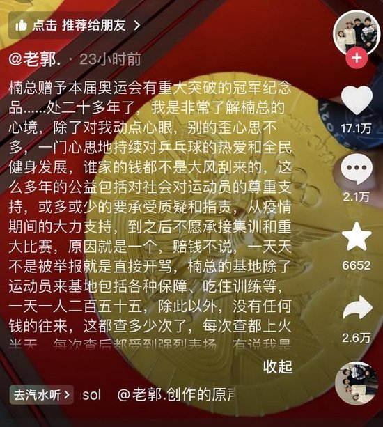 对于这次送“纯金”金牌的行为,有网友质疑王楠夫妇“蹭热度”,对此,郭斌在晒金牌的视频配文: