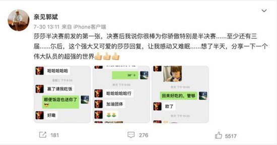 郭斌曾晒出过自己与孙颖莎的聊天记录