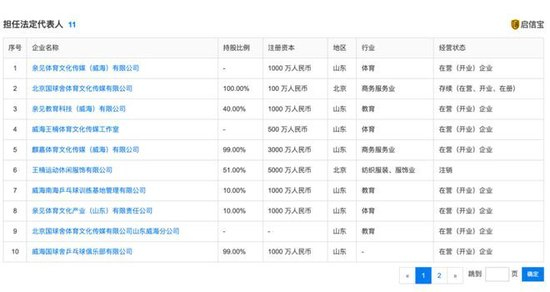 启信宝显示,王楠及其丈夫郭斌两人关联公司超过十家,包括亲见体育文化传媒(威海)有限公司、王楠运动休闲服饰有限公司、威海南海乒乓球训练基地管理有限公司等。