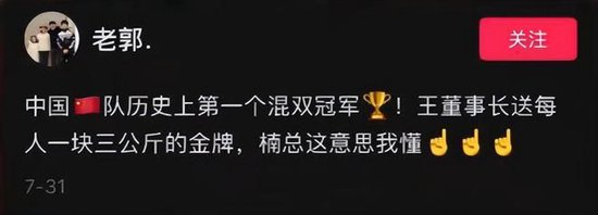 郭斌称这是赠予本届奥运会有重大突破的冠军纪念品,他此前曾发文要送“莎头”组合和马龙每人一块3公斤的金牌。