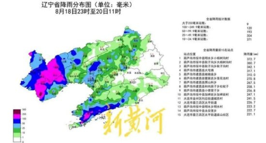 新黄河记者从辽宁省气象服务中心获悉,8月18日23时至20日11时,辽宁省西部、南部地区出现暴雨到大暴雨,葫芦岛地区的个别乡镇出现特大暴雨;其他大部地区出现小雨到中雨,局部大雨到暴雨。累计降雨量位列前三的是:葫芦岛市绥中县秋子沟乡大杨树沟村490.7毫米、葫芦岛市绥中县秋子沟乡474.0毫米、葫芦岛市建昌县娘娘庙乡437.8毫米。辽宁省平均降雨量为29.8毫米。