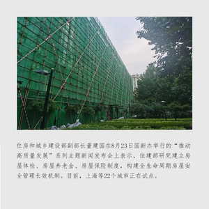 住房和城乡建设部副部长董建国在8月23日国新办举行的“推动高质量发展”系列主题新闻发布会上表示,住建部研究建立房屋体检、房屋养老金、房屋保险制度,构建全生命周期房屋安全管理长效机制。目前,上海等22个城市正在试点。