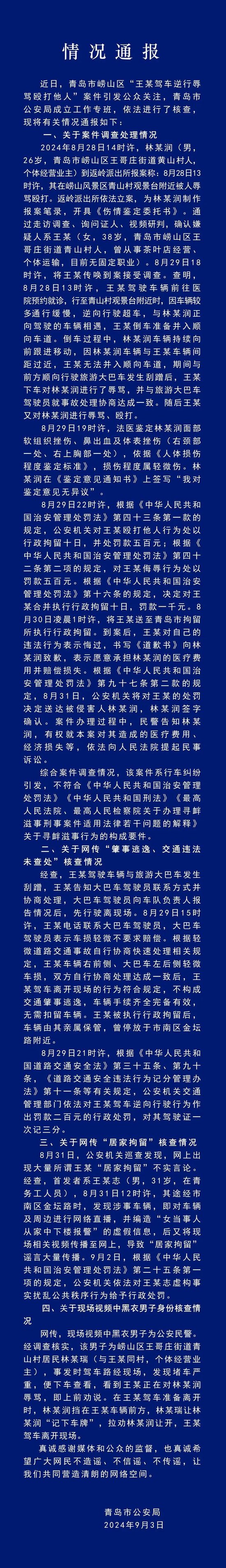 今天,青岛公安发布“王某驾车逆行辱骂殴打他人”案件的情况通报。通报称,近日,青岛市崂山区“王某驾车逆行辱骂殴打他人”案件引发公众关注,青岛市公安局成立工作专班,依法进行了核查。