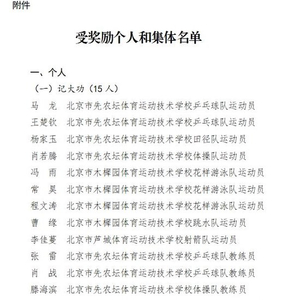 四、给予北京市先农坛体育运动技术学校、北京市木樨园体育运动技术学校2家单位集体记大功奖励,给予北京市什刹海体育运动学校、北京市芦城体育运动技术学校2家单位集体记功奖励,给予北京市体育科学研究所、北京市反兴奋剂中心、北京体育职业学院3家单位集体嘉奖。
