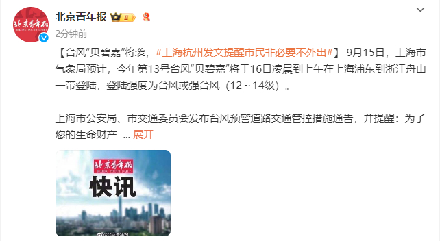 [台风“贝碧嘉”将袭,上海杭州发文提醒市民非必要不外出] 9月15日,上海市气象局预计,今年第13号台风“贝碧嘉”将于16日凌晨到上午在上海浦东到浙江舟山一带登陆,登陆强度为台风或强台风(12~14级)。