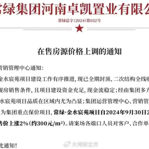 9月28日,河南本土房企河南卓凯置业有限公司发文称,自9月30日24时起,对旗下常绿·金水宸苑项目在售房源售价上调2%(约300元/平方米)。