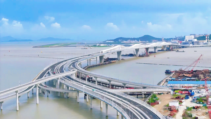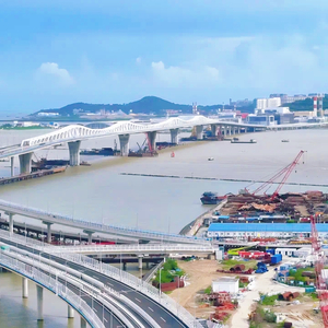 连接澳门和氹仔的第四条跨海大桥——澳门大桥,位于澳门友谊大桥东侧,横跨外港航道和澳门水道,将澳门海、陆、空三个重要口岸相连,是澳门首条双向八车道跨海大桥,也是构建澳门城市交通体系的关键节点。大桥主线全长3.085公里,其中跨海段长约2.86公里,主桥长1370米,设置通航孔桥两座,主跨280米,桥梁主体结构使用Q420等高性能桥梁钢,整体构造轻质高效,结构设计使用年限为100年。中铁工业承担了南主桥、南引桥及A区互通立交等钢结构生产制造任务。